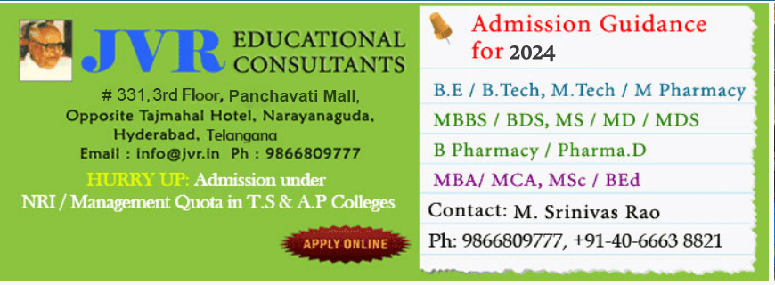 For NRI / Management quota admissions (B.E. / B.Tech. / MBBS / BDS) in Telangana & Andhra Pradesh, Contact : Mr. M.Srinivasa Rao, Mobile: +91-98668 09777, Ph: +91 40 6663 8821. Email Id :